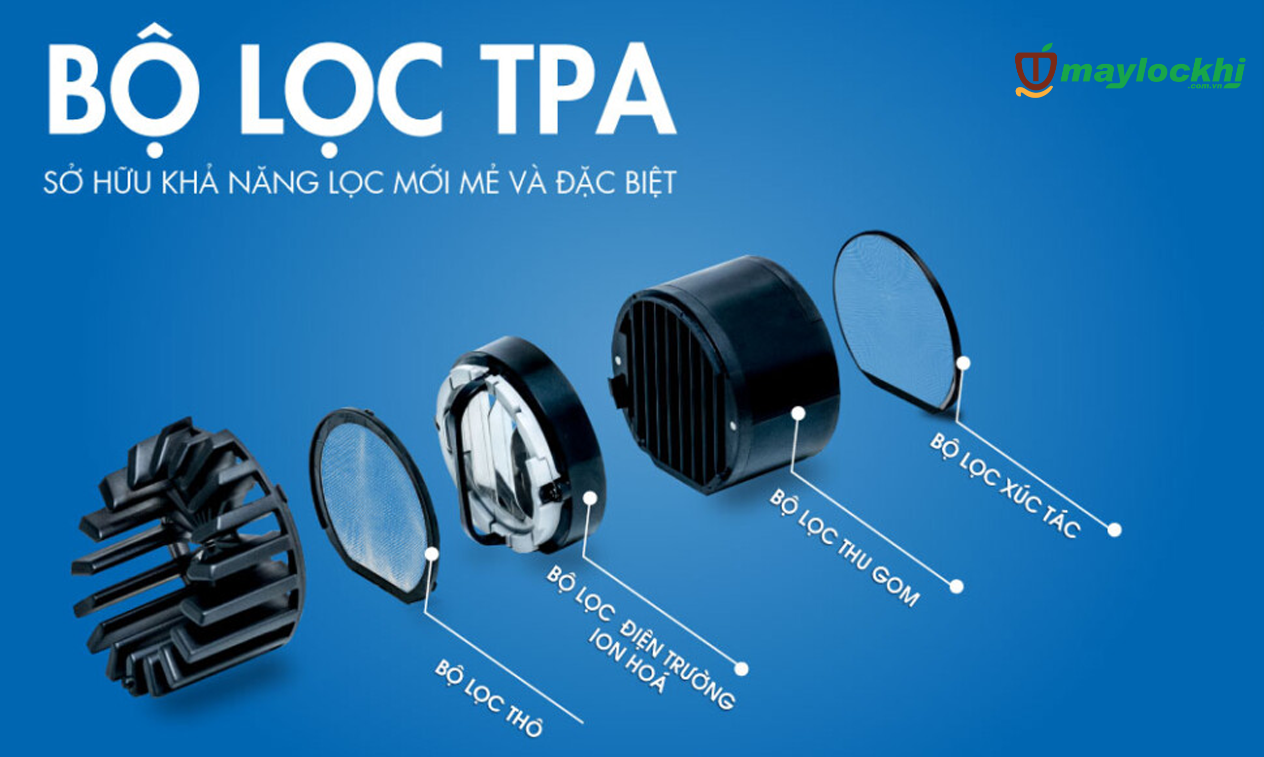 Bộ lọc TPA được thiết kế thông minh với 4 tầng lọc: Bộ lọc thô + bộ lọc trường điện từ ion hóa + bộ lọc thu gom + bộ lọc xúc tác. Điểm đặc biệt của các bộ lọc này là có thể vệ sinh và tái sử dụng mà chất lượng lọc vẫn như mới.