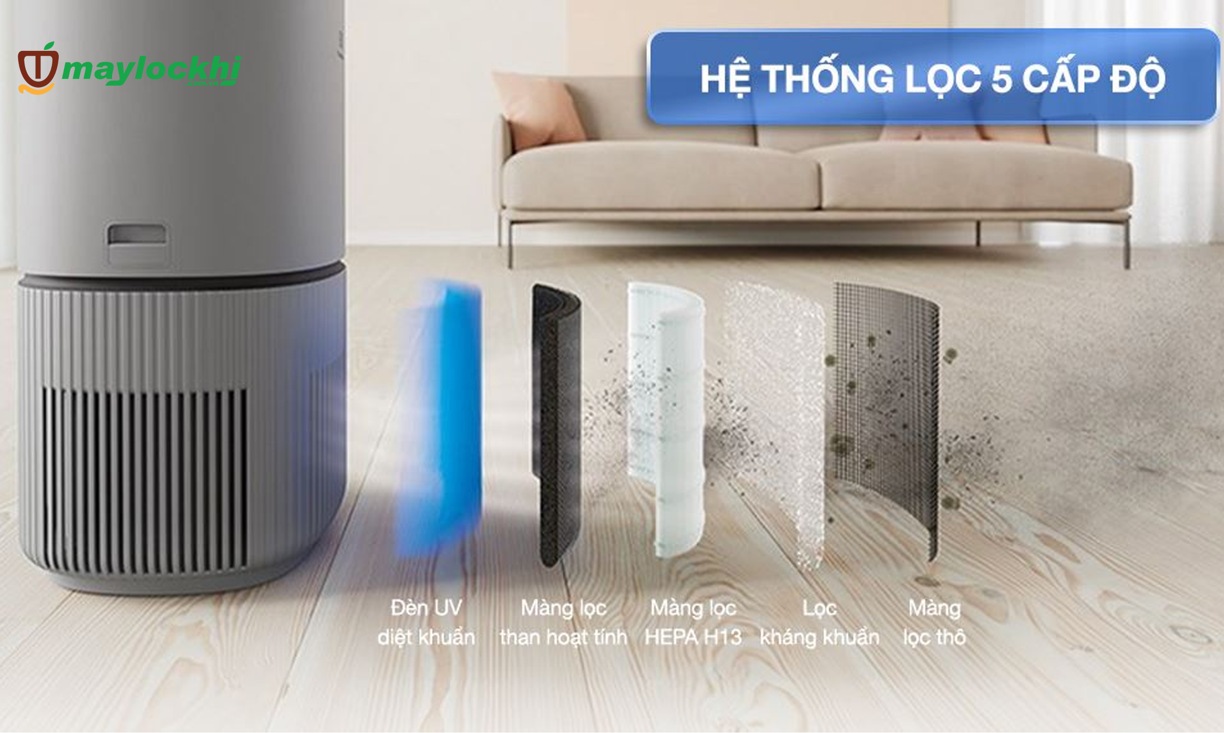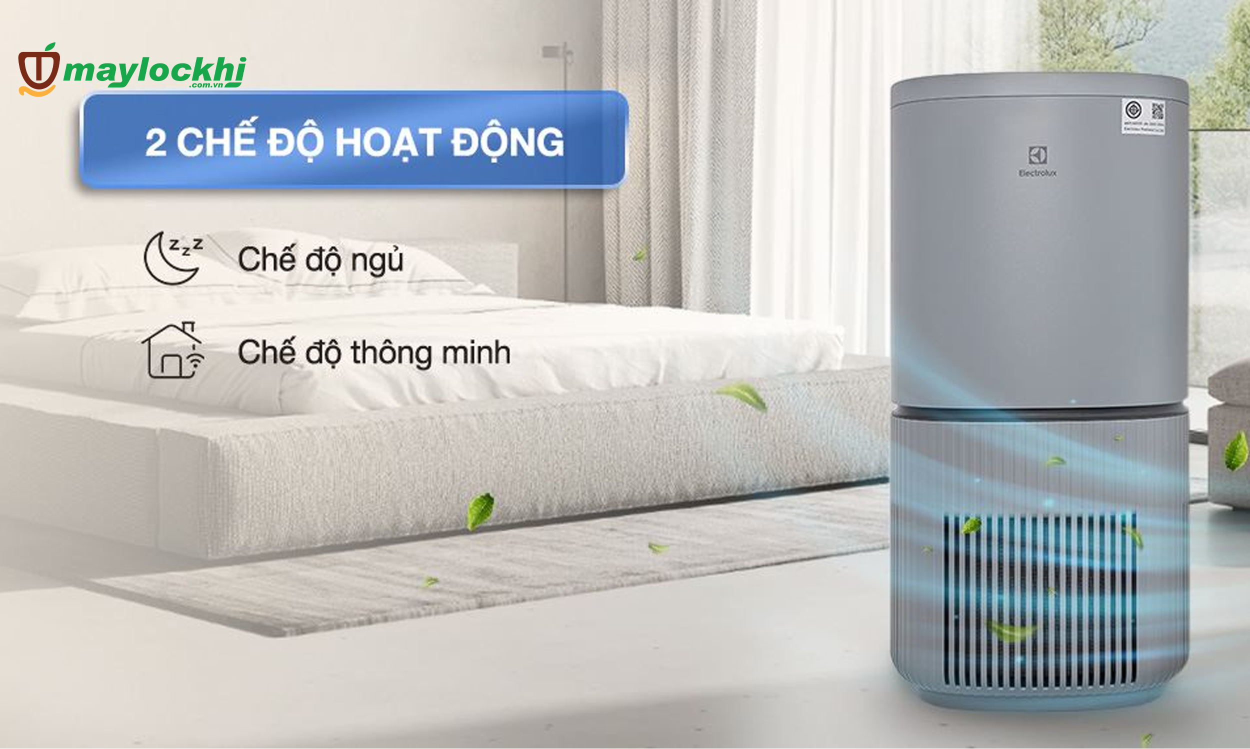 - 5 mức độ lọc đi kèm với 2 chế độ hoạt động: chế độ ngủ (Sleep) và chế độ lọc thông minh giúp máy lọc sạch không khí hiệu quả.